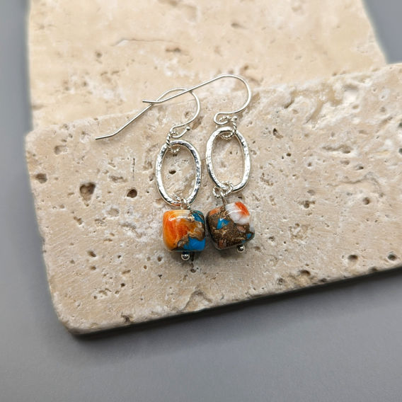 Spiny oyster turquoise is a unique and vibrant stone combining turquoise with spiny oyster shell, a marine mollusk known for it's rich, colorful shell. The turquoise adds striking blue or green hues, while the spiny oyster shell introduces shades of orange, red, purple, and white.